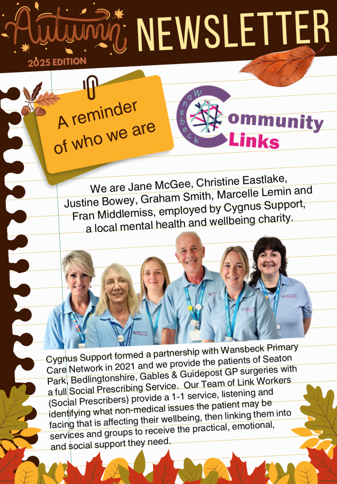 Community Links is created by Cynus Support along with Wansbeck Primary Care Network as they formed a partnership together in 2021. Through this partnership they provide the patients of Seaton Park, Bedlingtonshire, Gables & Guidepost GP surgeries with a full Social Prescribing Service. Please find further information and social prescribing service below in their Autumn 🍂 Newsletter.