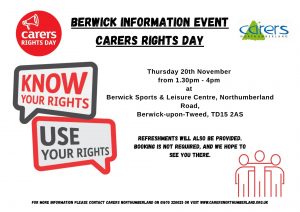 On Thursday, 20th November, Northumberland Autistic Society (NAS) is attending the Carer Rights Information Day at the Leisure Centre in Berwick. The branch will have a table there and it is a great opportunity to see what else is on offer locally. Please view the flier below.