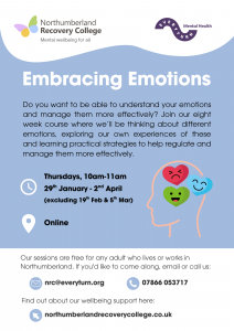 On Thursday, 5th February the Northumberland Recovering College (NRC) is running a 8-week DBT skills course called Embracing Emotions. This week individuals will learn how to recognise and name their emotions using practical strategies to support them. During this course individuals will learn how to understand their emotions along with finding out practical strategies which will help them to manage their emotions more effectively. These sessions are free and available to anyone aged 18+ who lives or works in Northumberland. If you are interested please fill out the NRC Referral Form here.