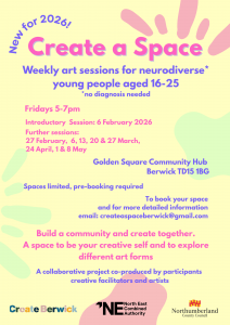 On Friday 6th February, Create A Space are hosting an introductory art session as part of their program to offer weekly art sessions for neurodiverse young adults aged 16-25. These sessions will take place each Friday between 5-7pm at Golden Square Community Hub in Berwick.