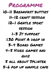On Thursday, 19th March SpLinter is launching their new hub on Wagonway in Alnwick. During the launch event we will be running craft sessions, doing a quiz, playing video games and sharing some food through our pop-up cafe. Everyone welcome. There will also be opportunities to learn about SpLinter and Point A drop in sessions. We look forward to meeting you. Please find further details below…